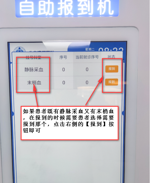 患者在采血前,只需前往医院设置的自助报到机处,通过两种便捷方式完成报到:一是扫描诊疗单据上的门诊号码,二是直接将身份证放置在指定区域。需要注意的是,诊疗单据自开具之日起30天内有效,若超出有效期则无法完成报到,建议患者在有效期内及时前往采血。