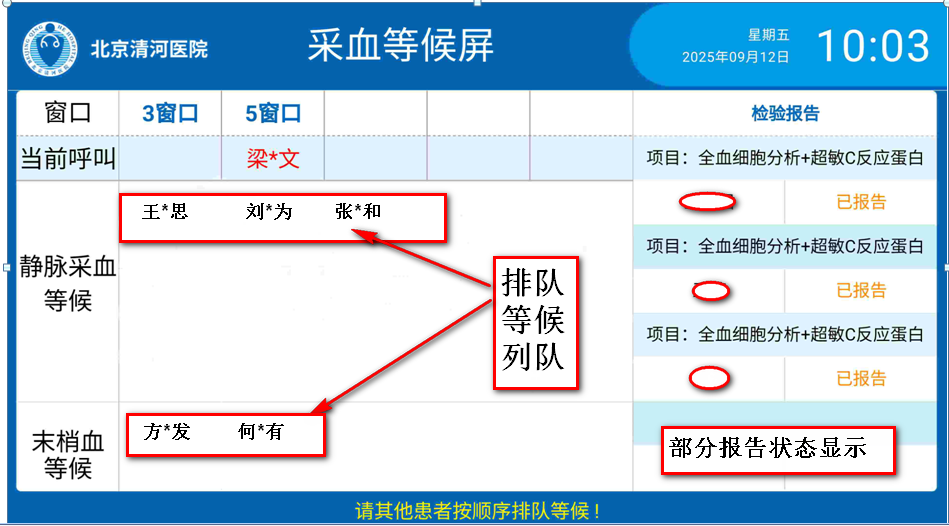 成功报到后,患者便会自动进入排队候诊队列,无需再在采血窗口前扎堆等候。医院在采血区域设置了醒目的候诊大屏,大屏会实时滚动显示正在采血的患者信息以及等候患者的队列顺序,患者坐在等候区即可清晰掌握自身的等候进度。这一设计让患者无需时刻关注窗口动态,可利用等候时间合理安排休息或处理其他事务,极大的缓解了等候时的焦虑感。