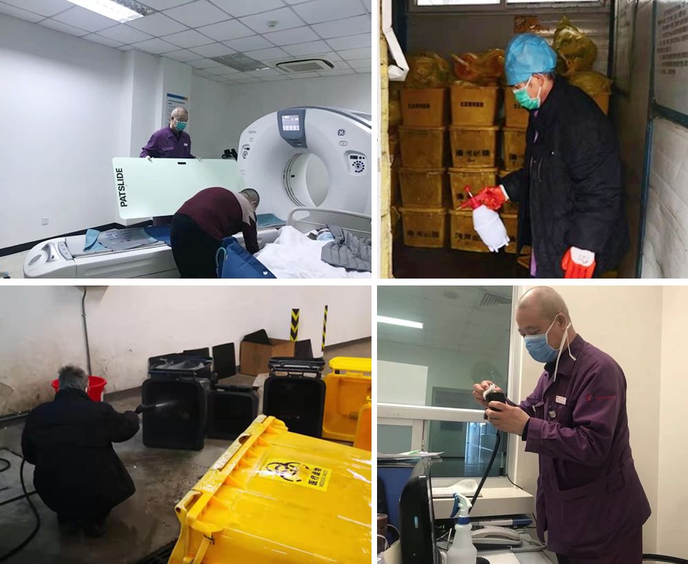 自疫情爆发以来,医院全面启动院区消毒工作。增设场地划片责任人,负责院内各区域的消毒卫生及防控工作。车辆进入院区需进行消毒液喷洒,人员进入大楼需经严格询问接触史并测量体温后方可进入。医院还增加保洁人力,保洁人员经过院感委员会的培训,对医院大楼内的空气、物体表面、地面、复用物品等等一切物品进行专业的消毒处理,消毒频次大于一天3次。