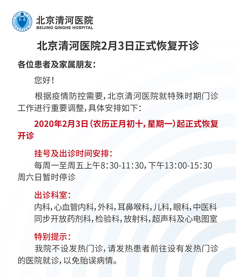 特别提醒:由于防控物资紧缺,我院暂无力为患者提供防护口罩,请患者到院就诊前自行佩戴口罩防护,未佩戴口罩的患者依北京市卫建委文件规定,不可进入院区。