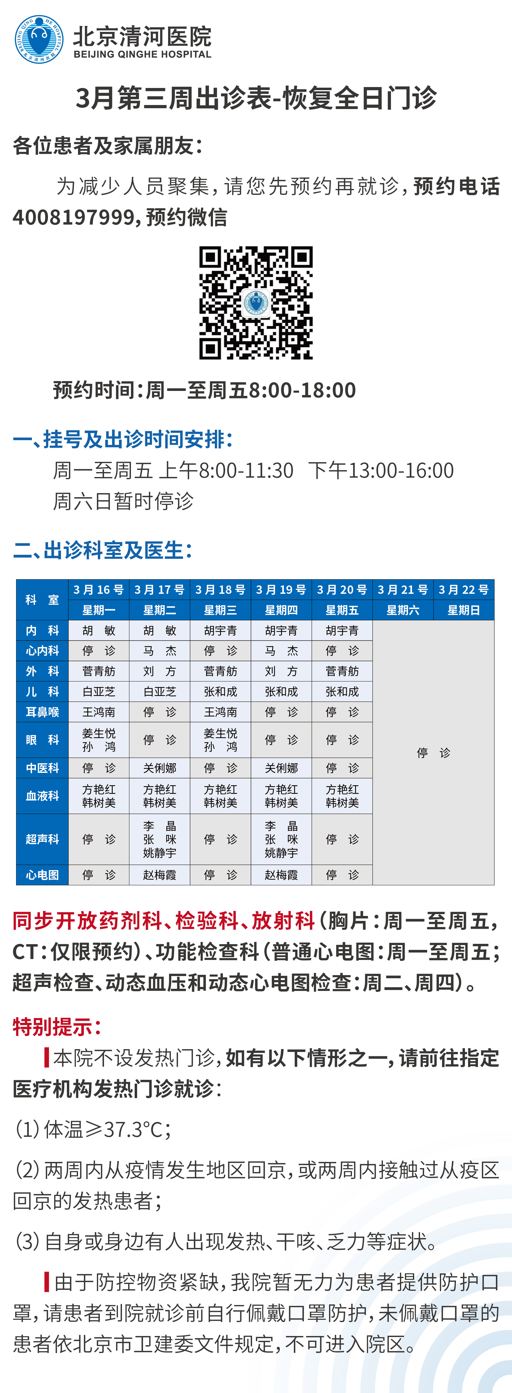 北京清河医院3月第三周出诊表-恢复全日门诊