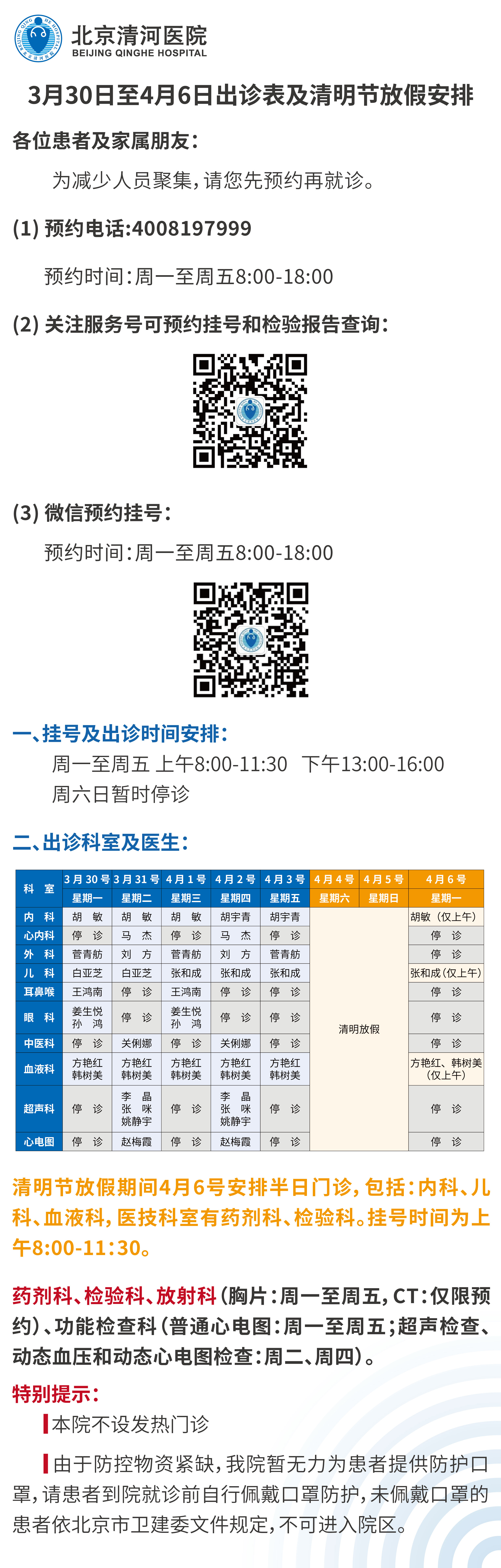 北京清河医院3月30日至4月6日出诊表及清明节放假安排