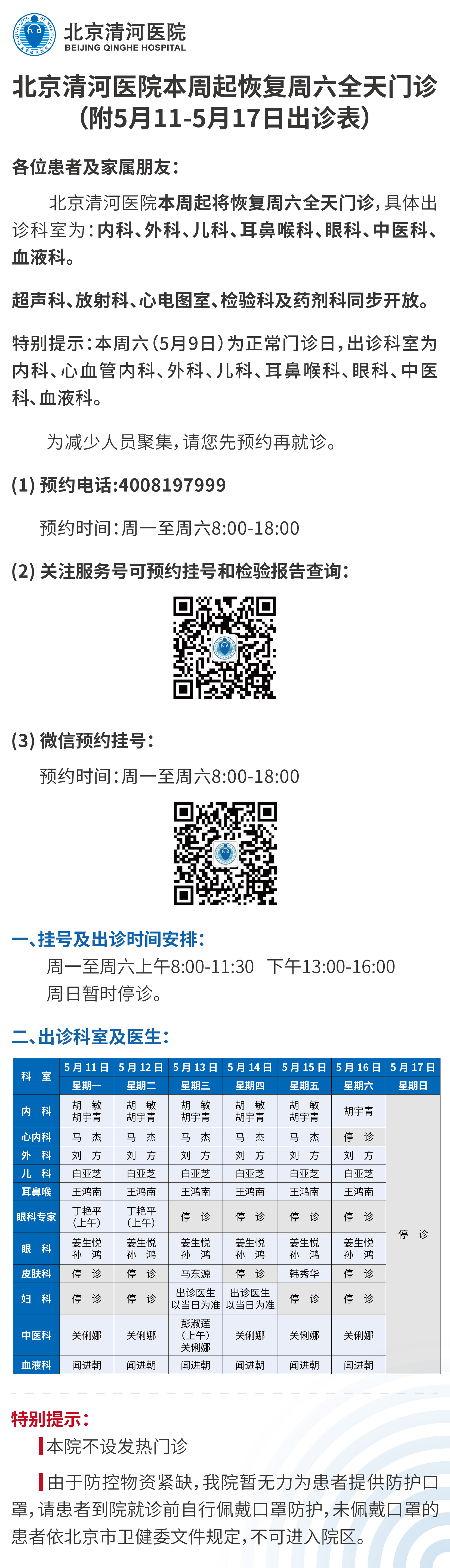 北京清河医院本周起恢复周六全天门诊(附5月11-5月17日出诊表)