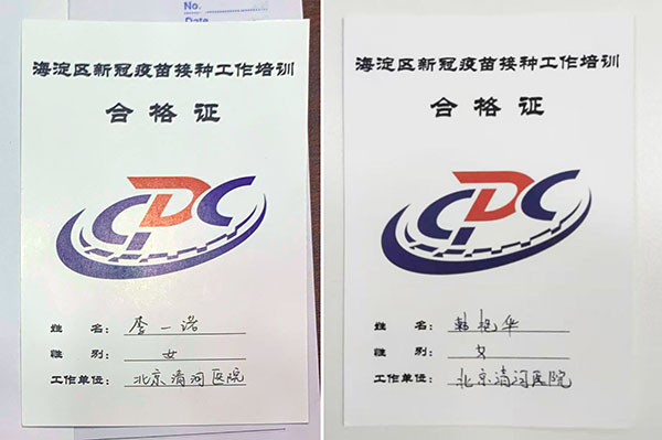 两名白衣天使于2021年1月4日参加北京海淀区疫苗后备队培训班并认真梳理培训笔记,随时做好“出征”准备。1月8日晚,医院紧急收到派遣任务,立即着手安排相关工作。第二天一早两名护士听从医院调遣,准时到达北京市公安局海淀分局曙光派出所第二社区警务工作站开始为期两天的新冠疫苗接种工作,两人两天共计接种981人次,主要接种人群涉及服务业、餐饮业、工业及军人等。