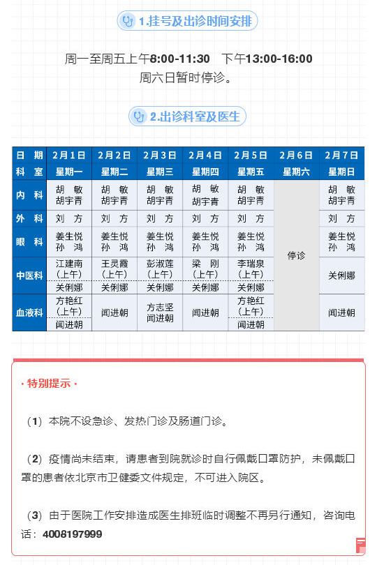 北京清河医院2月1日-7日出诊表
