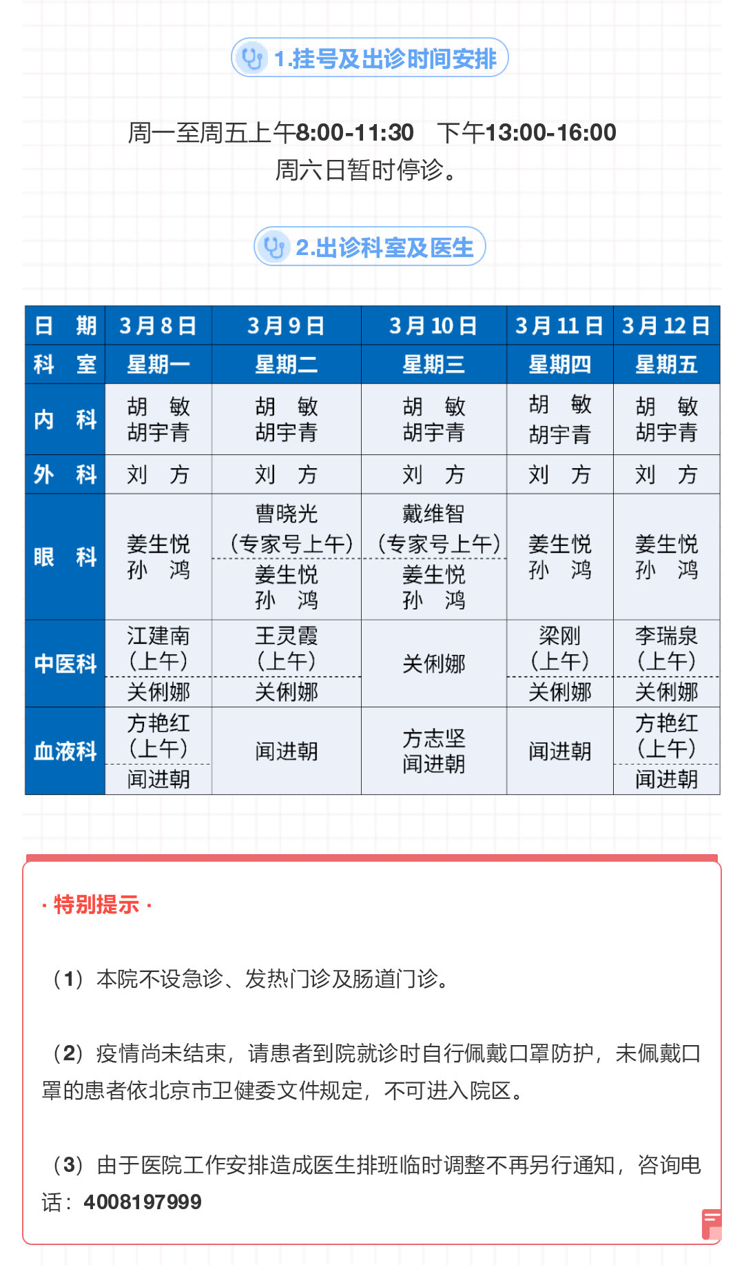 北京清河医院3月8日-12日出诊表