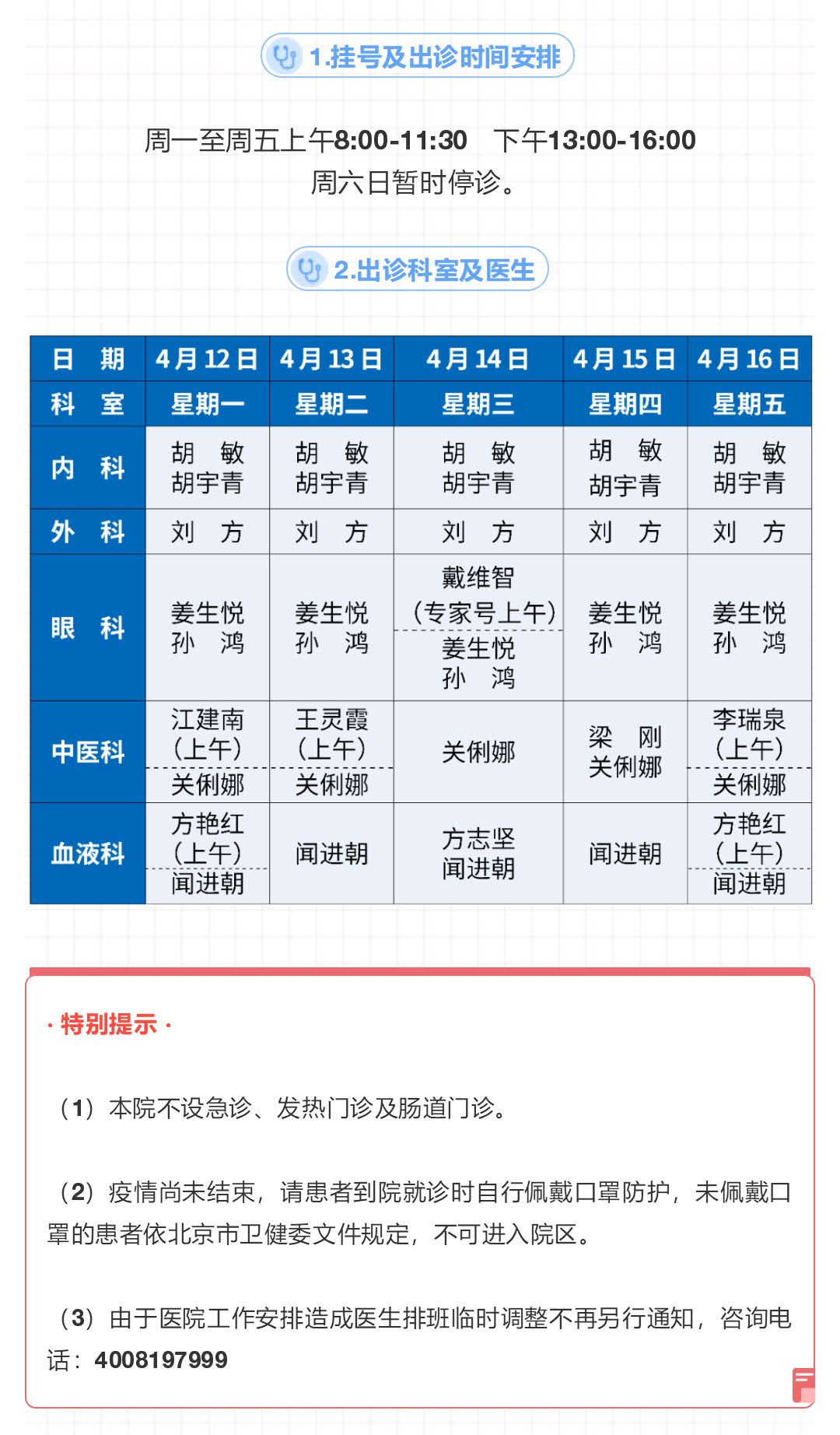 北京清河医院4月12日-16日出诊表
