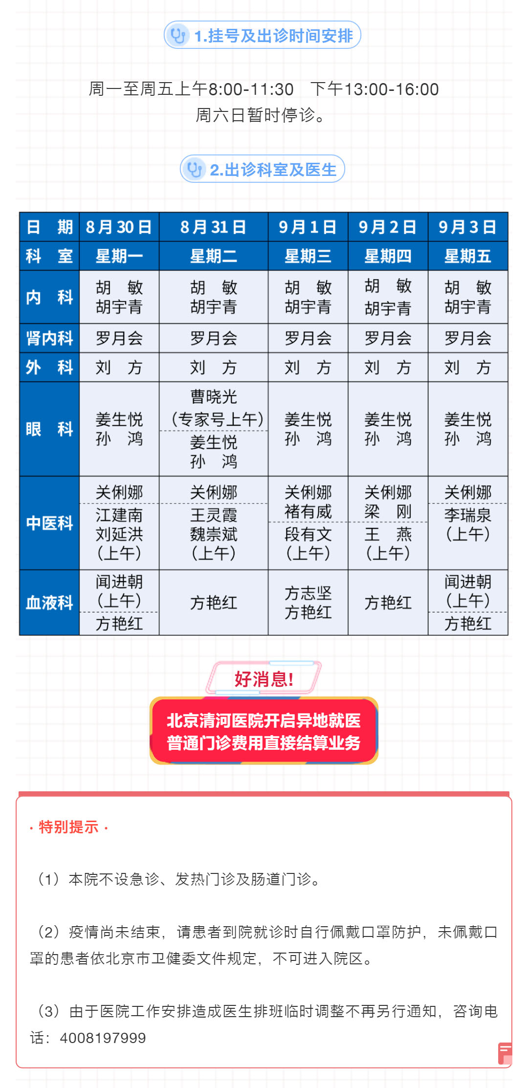 北京清河医院8月30日-9月3日出诊表