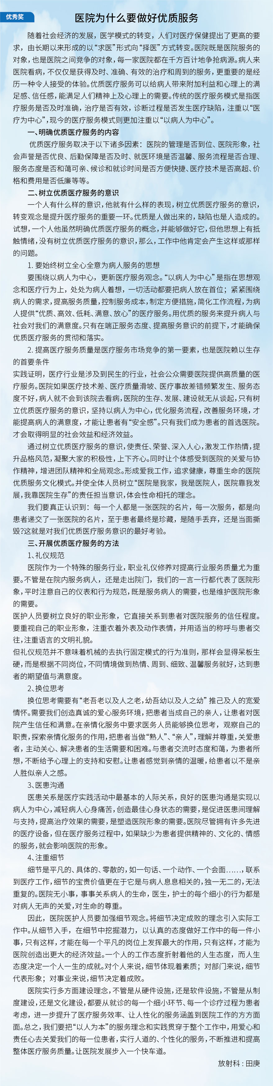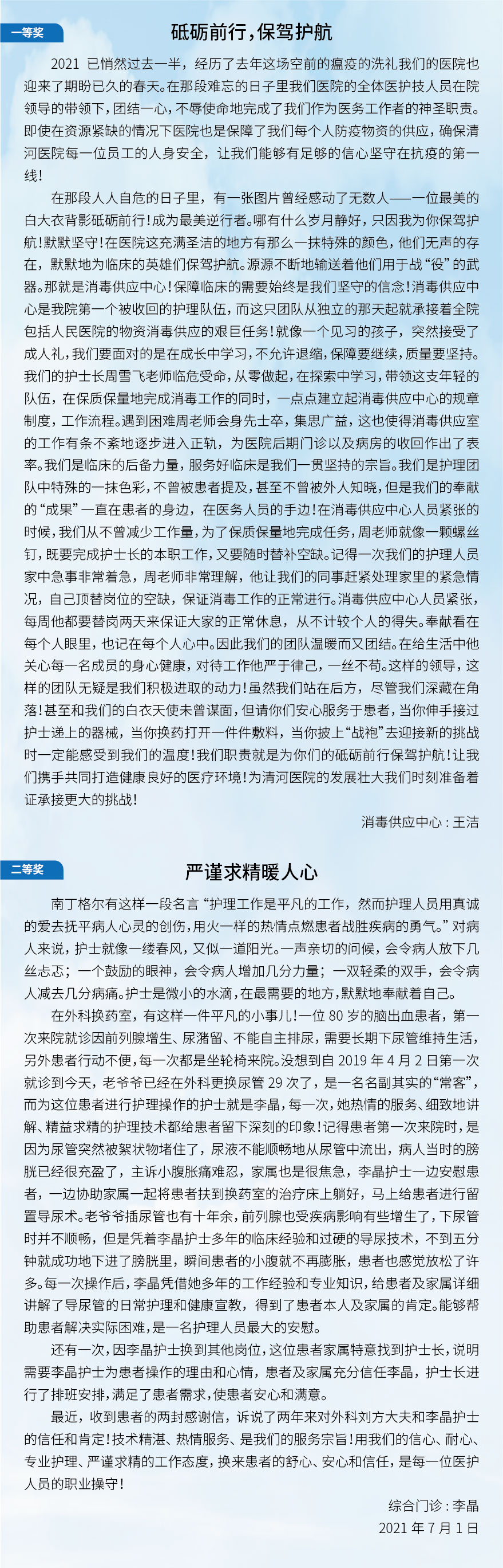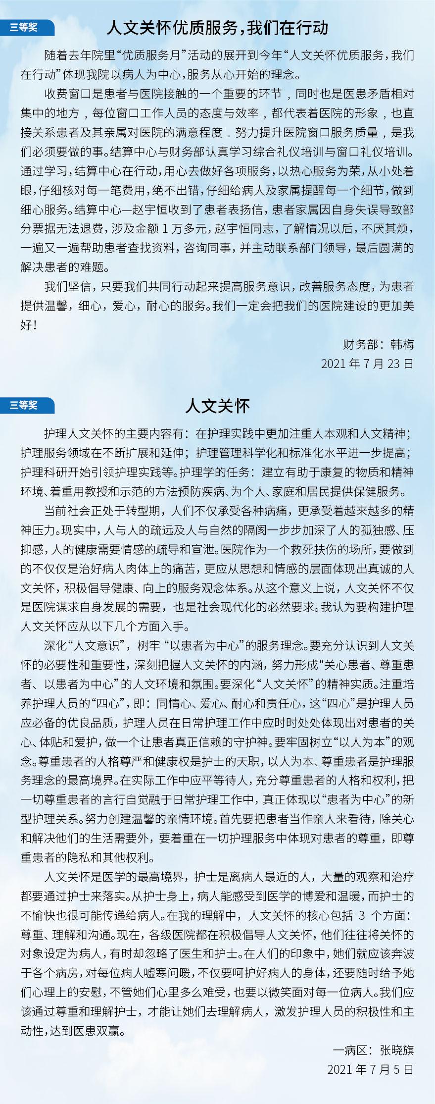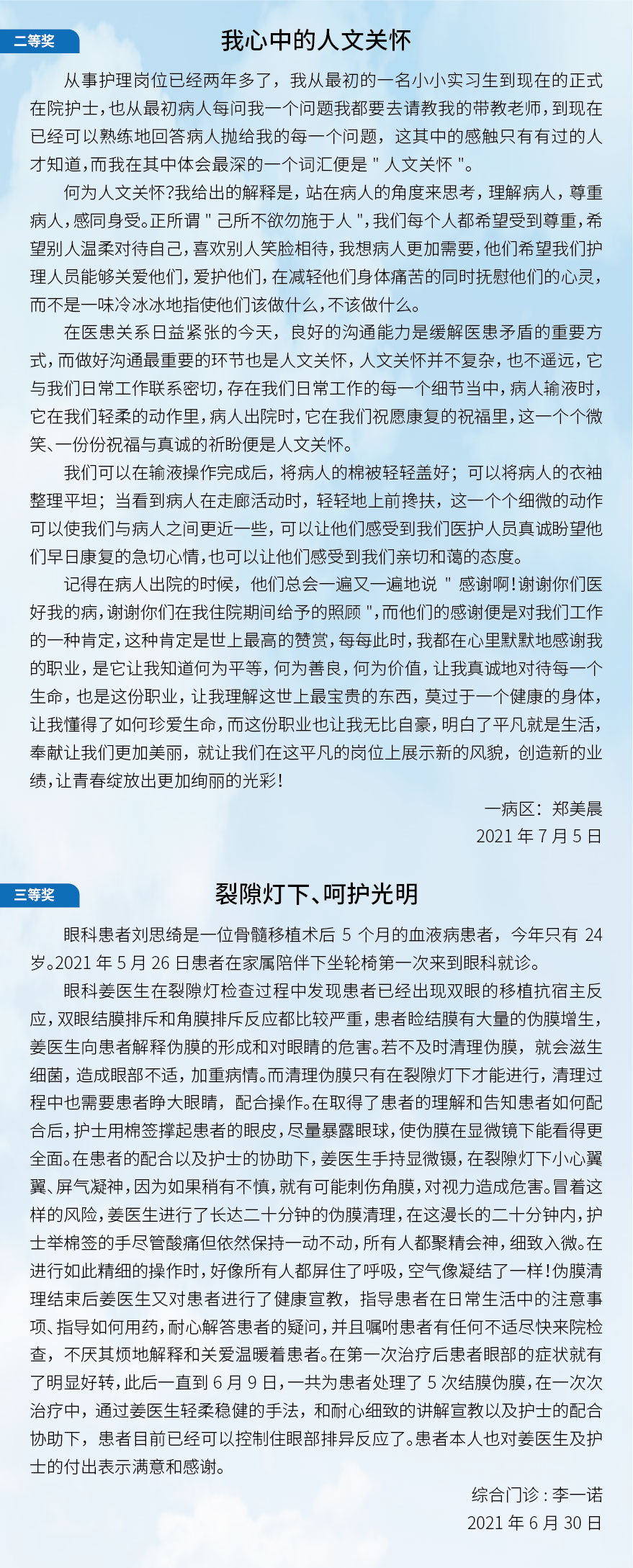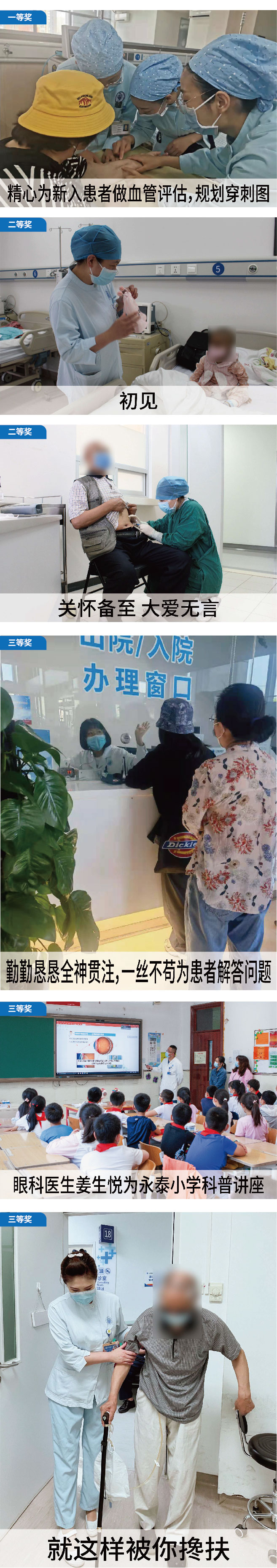 我院的每一名医务工作者,都将人文关怀深入到本职工作中,电梯间偶遇时的微笑,门诊接诊时的一声“您好”,等候区的轻声安抚……医院的每一处角落,都在上演着不同的人文关怀场景。