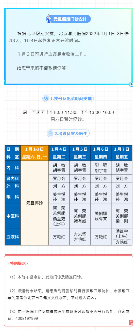 北京清河医院2022年元旦假期门诊安排及1月1日-7日出诊表