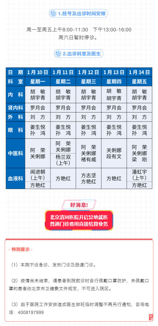 北京清河医院2022年元旦假期门诊安排及1月1日-7日出诊表