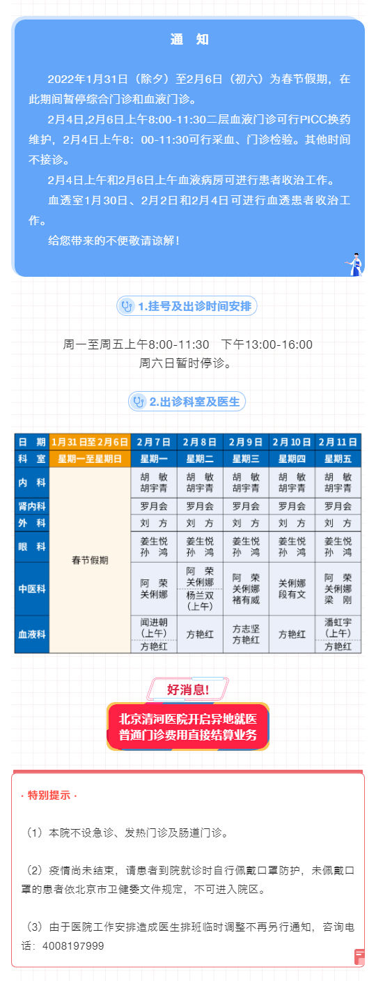 北京清河医院春节放假通知及1月31日-2月11日出诊表