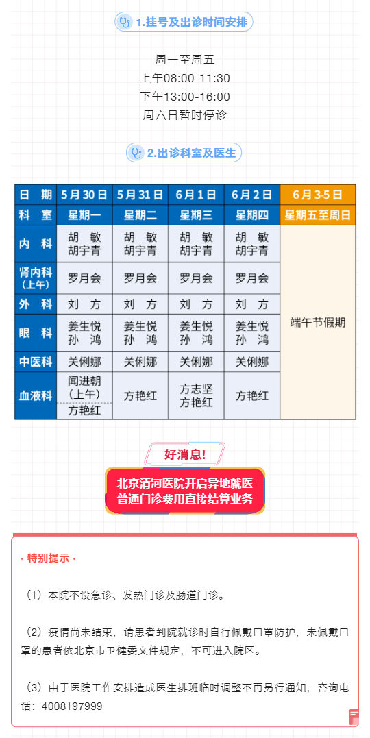 北京清河医院5月30日至6月5日出诊表