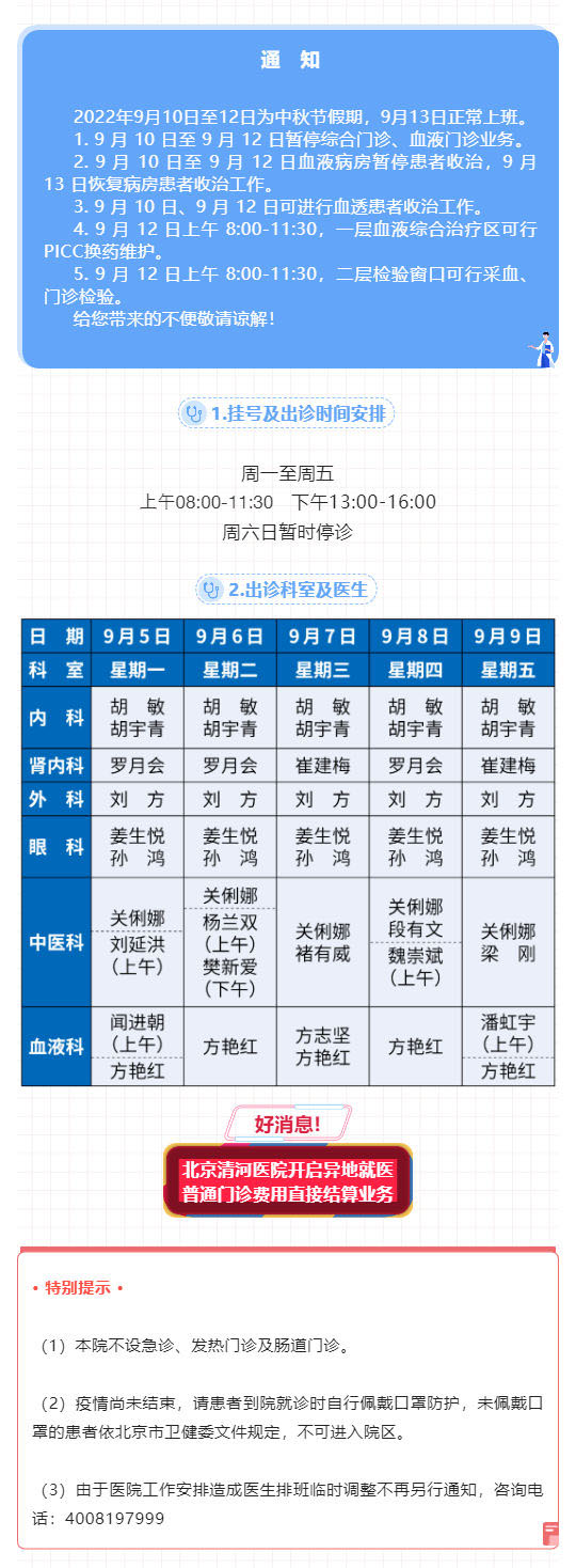 北京清河医院中秋节放假通知及9月5日至9日出诊表