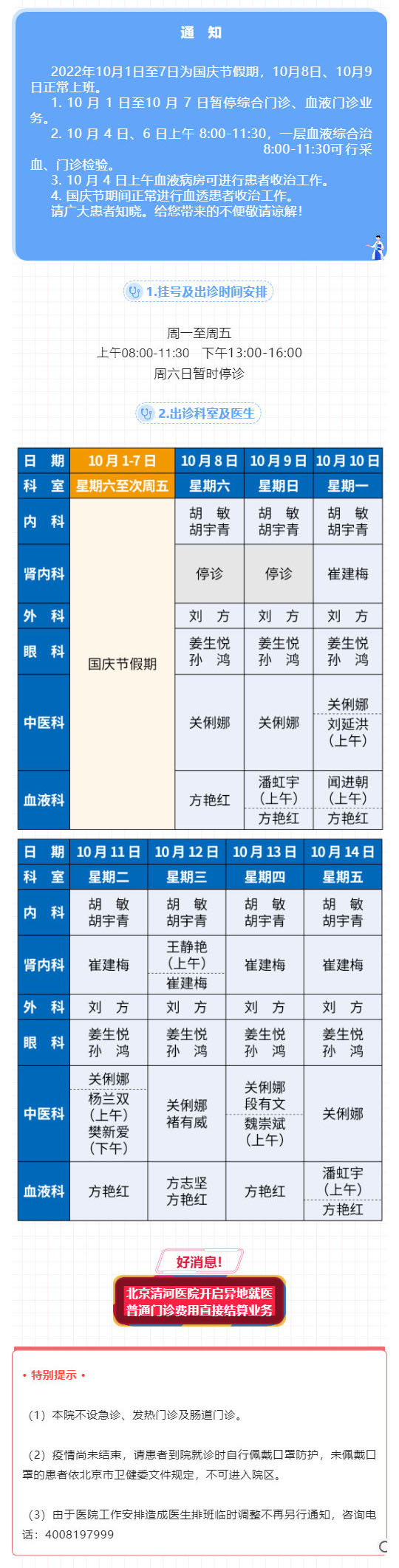 北京清河医院国庆节放假通知及10月1日至14日出诊表