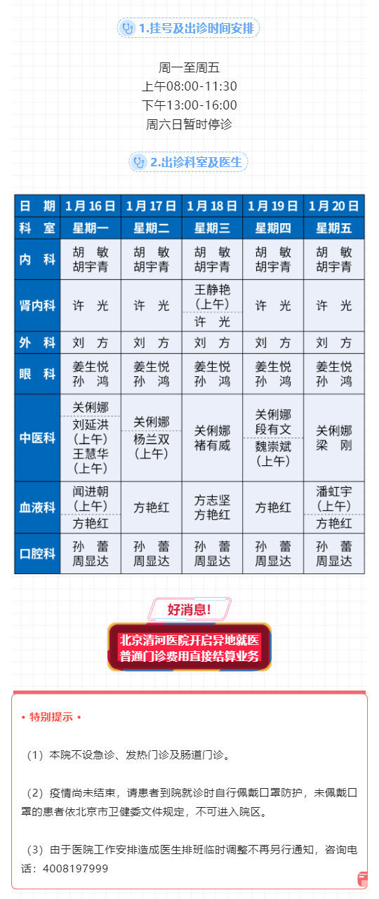 北京清河医院1月16日至20日出诊表