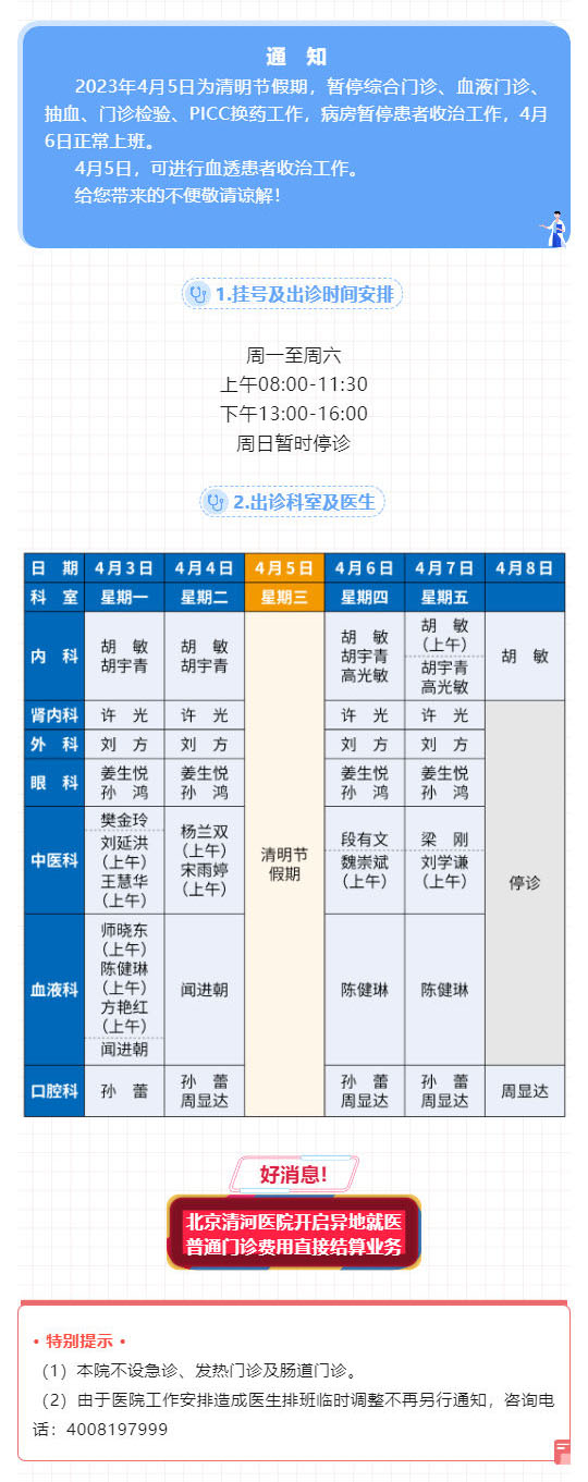 北京清河医院清明放假通知及4月3日至8日出诊表