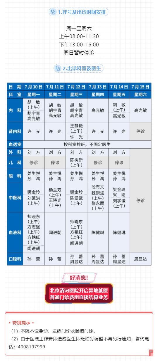 北京清河医院7月10日至15日出诊表