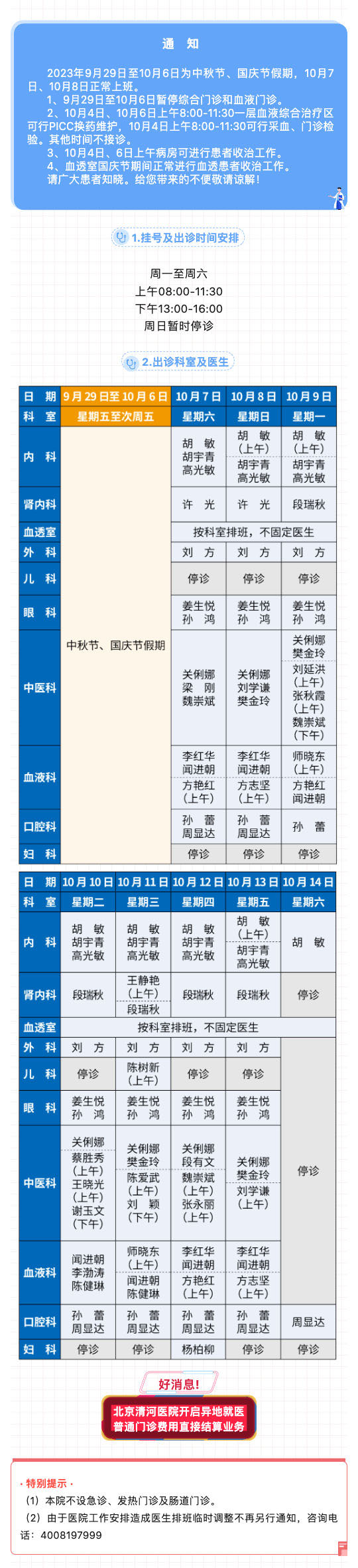 北京清河医院中秋节、国庆节放假通知及9月29日至10月14日出诊表