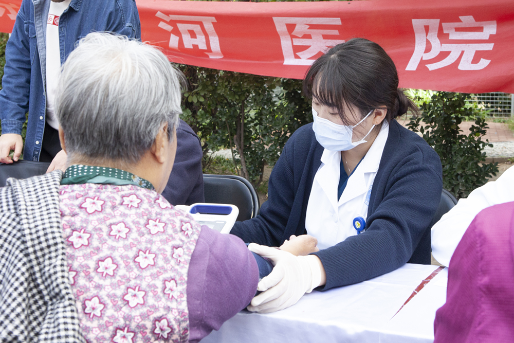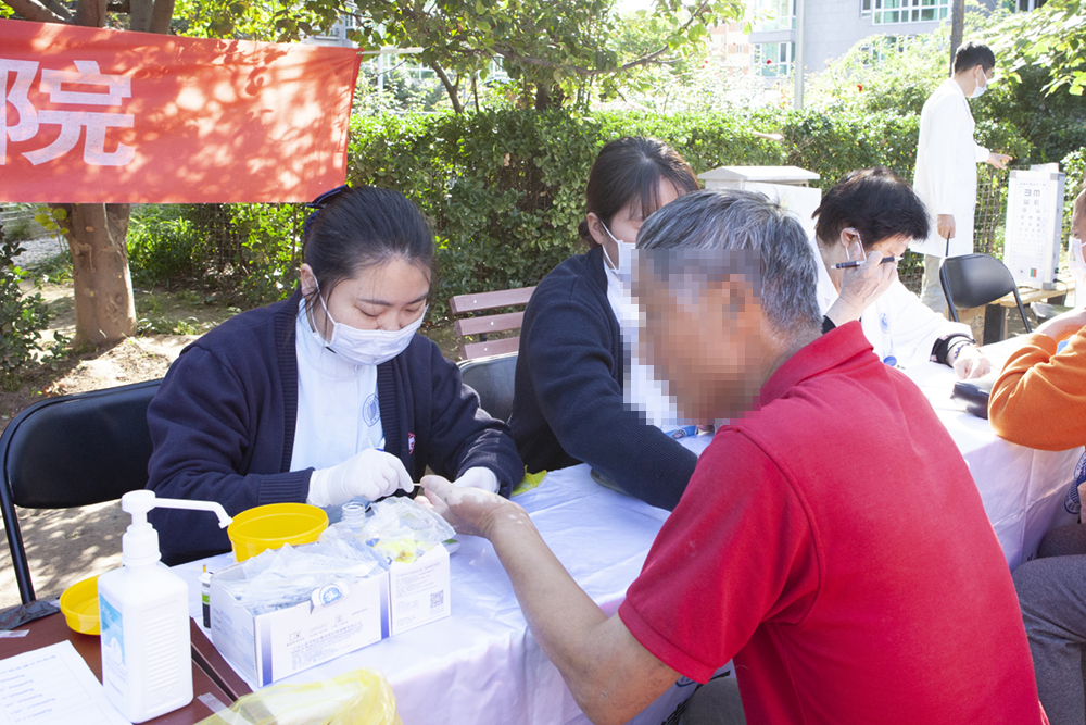 我院护士为现场100多位居民进行了量血压、测血糖的基础检查,并为居民进行健康宣教,增加居民对慢性疾病知识的了解和认识。