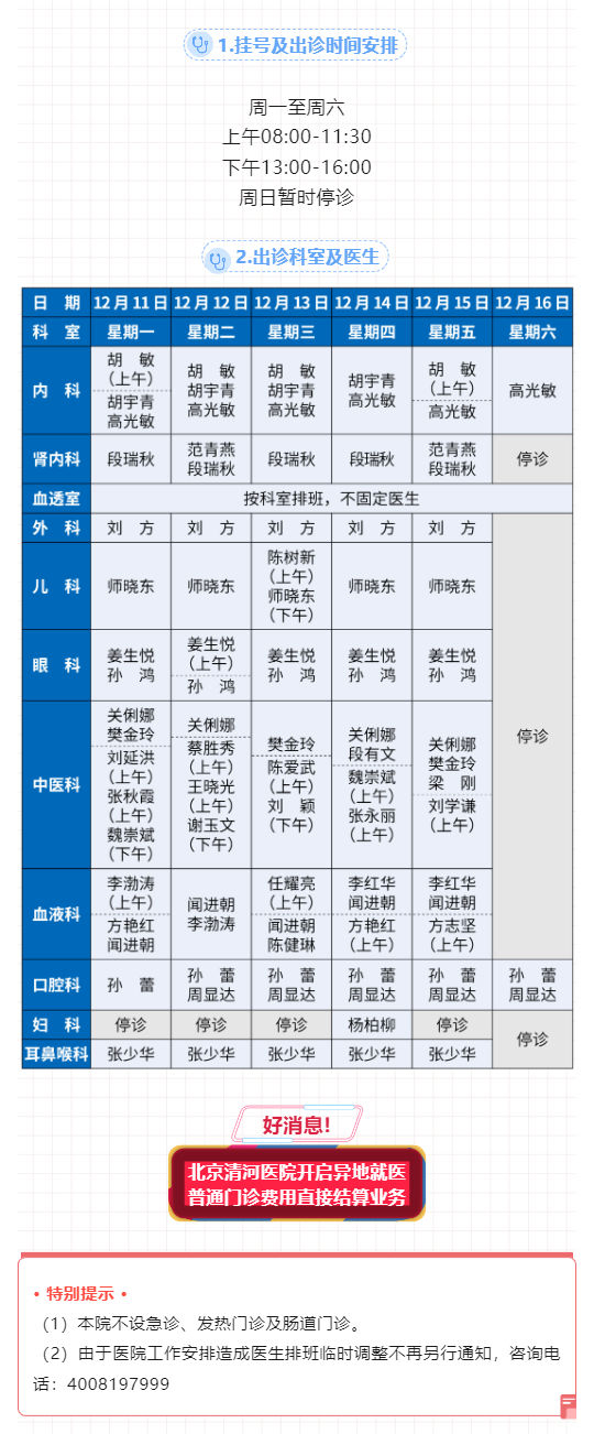 北京清河医院12月11日至16日出诊表