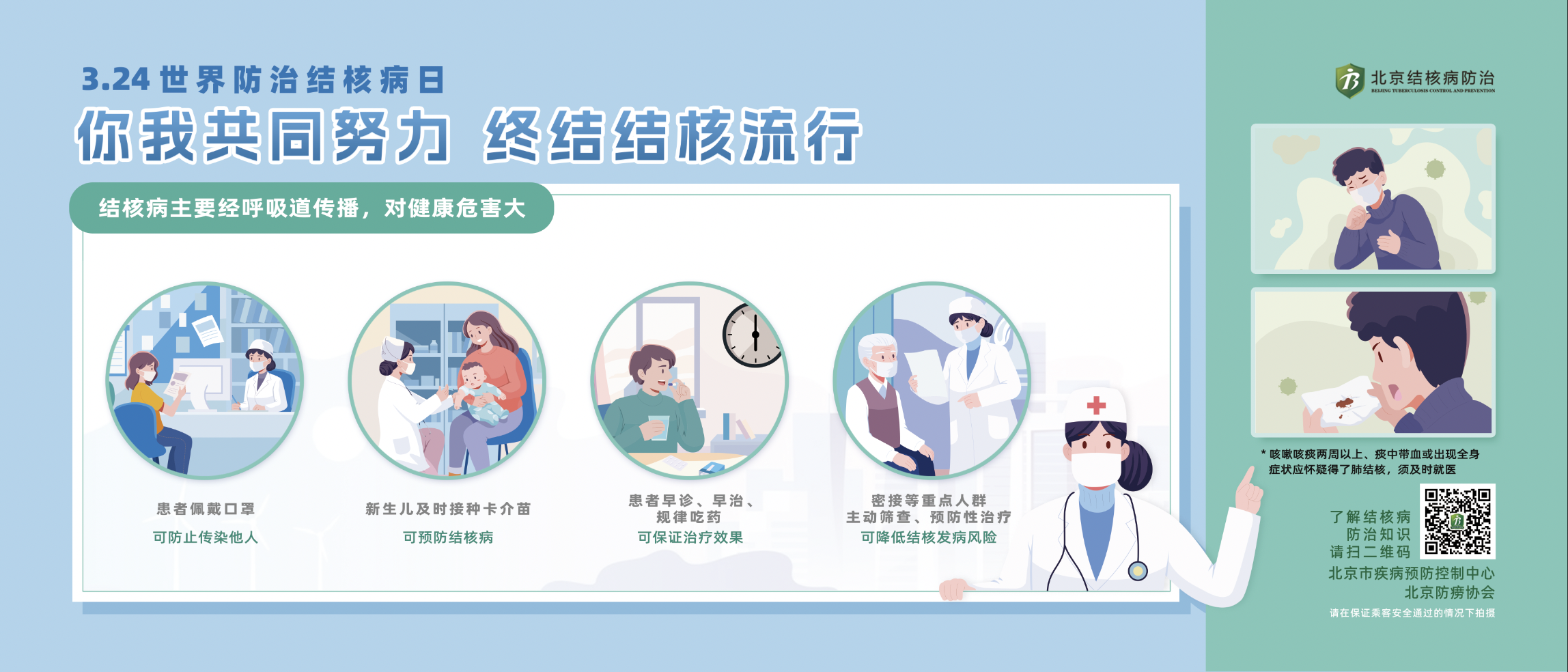 肺结核是一种古老的传染病。人类从没有停止过与结核病的斗争,但到目前结核病仍然是威胁人类健康与发展的重大传染病。2024年3 月24日是第29个世界防治结核病日,我国的宣传主题是: 你我共同努力,终结结核流行。