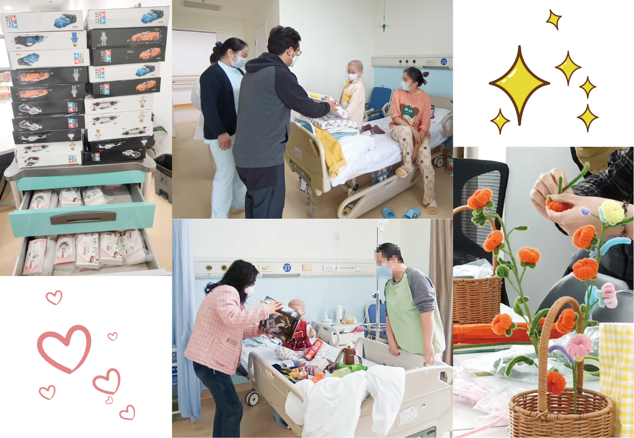爱心公益机构还专门为6病区的孩子们准备了精美礼物,走进病房、将礼物亲自送到患儿手中,爱心公益机构志愿者陪同患儿与家长一起制作手工艺品,通过活动鼓励孩子们积极面对治疗,勇敢面对生活。通过自己的创作获得成就感,增强自信心。在这爱与欢笑传递的空间里,让孩子与家长一起放松心情、缓解压力,感受社会的温暖与关爱。
