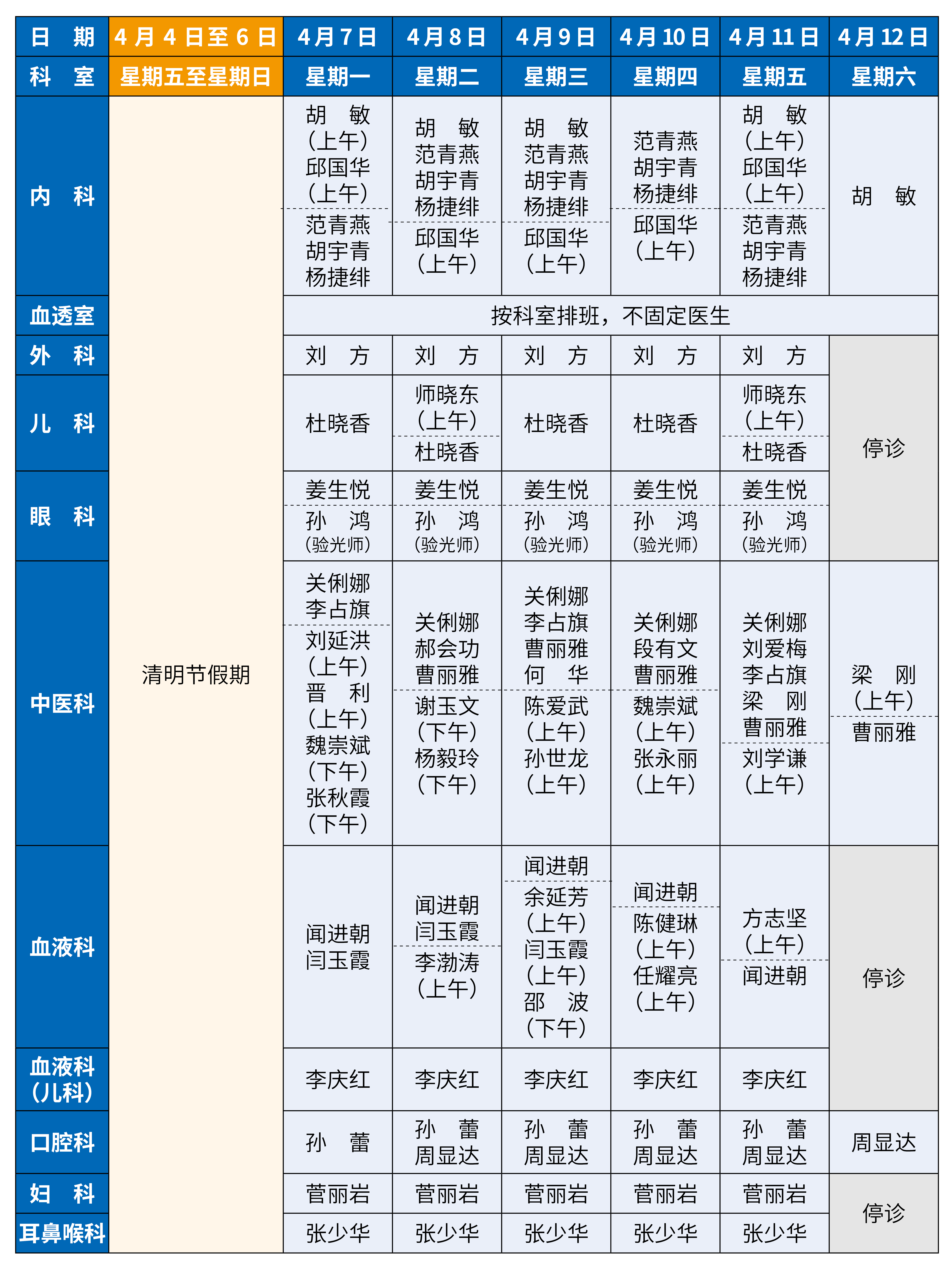 1. 4 月4 日至4 月6 日,暂停综合门诊、血液门诊、抽血、门诊检验和PICC 换药,4 月7 日正常上班。