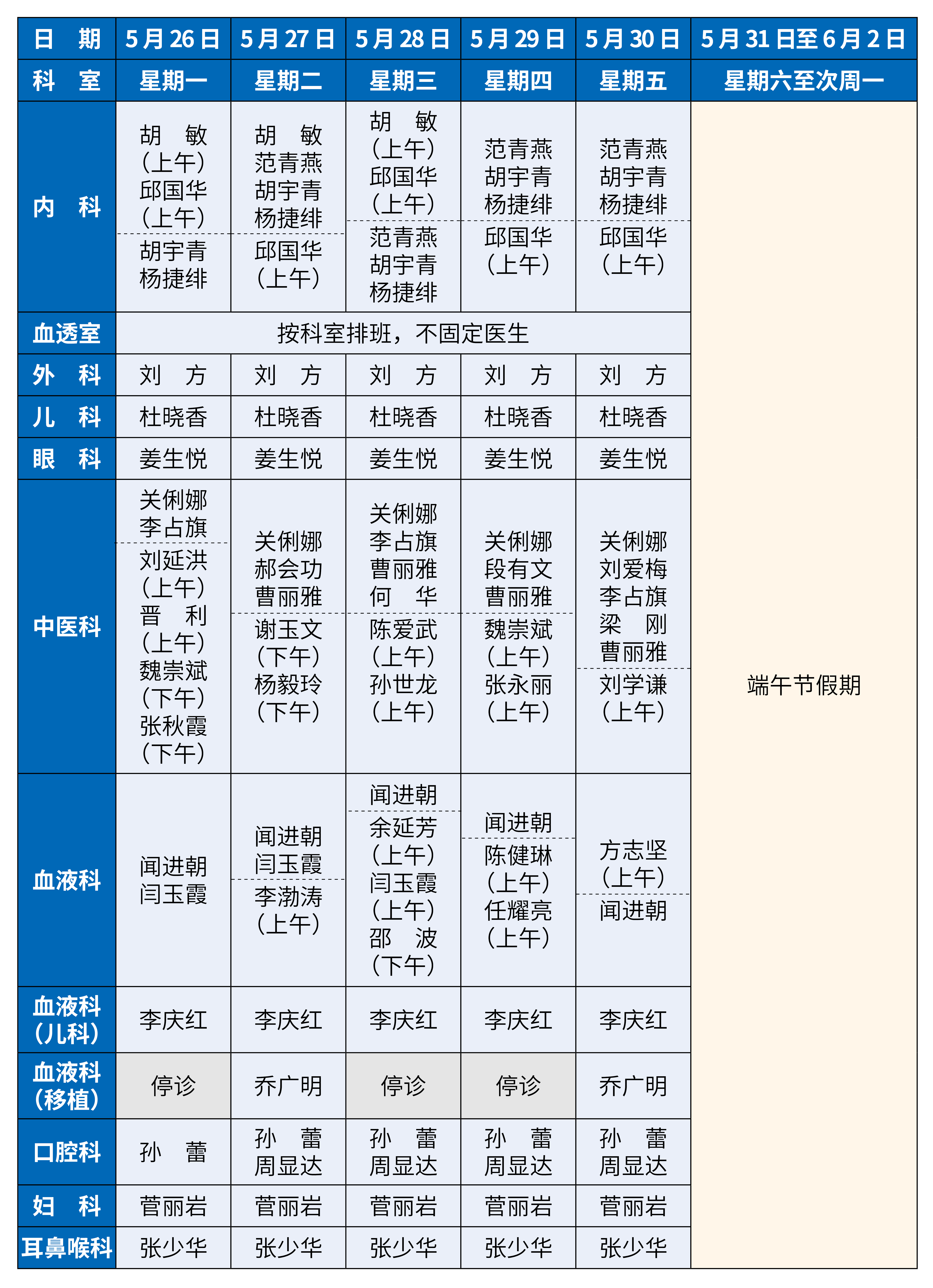 北京清河医院端午节放假通知及5月26日至30日出诊表