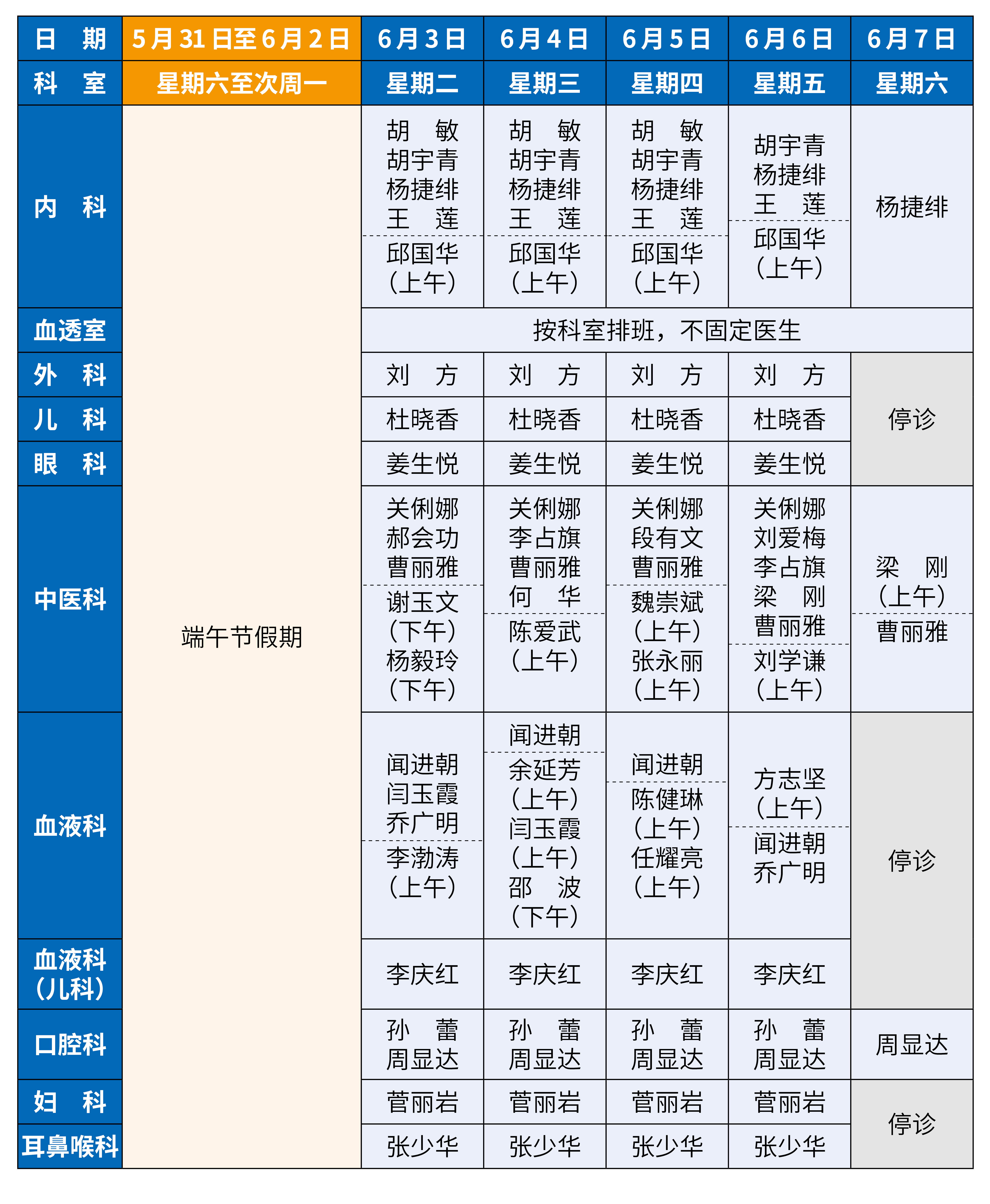 1、5月31日至6月2日,暂停综合门诊、血液门诊、采血窗口、门诊检验和PICC换药。2、节日期间血透室正常进行血透患者收治工作。