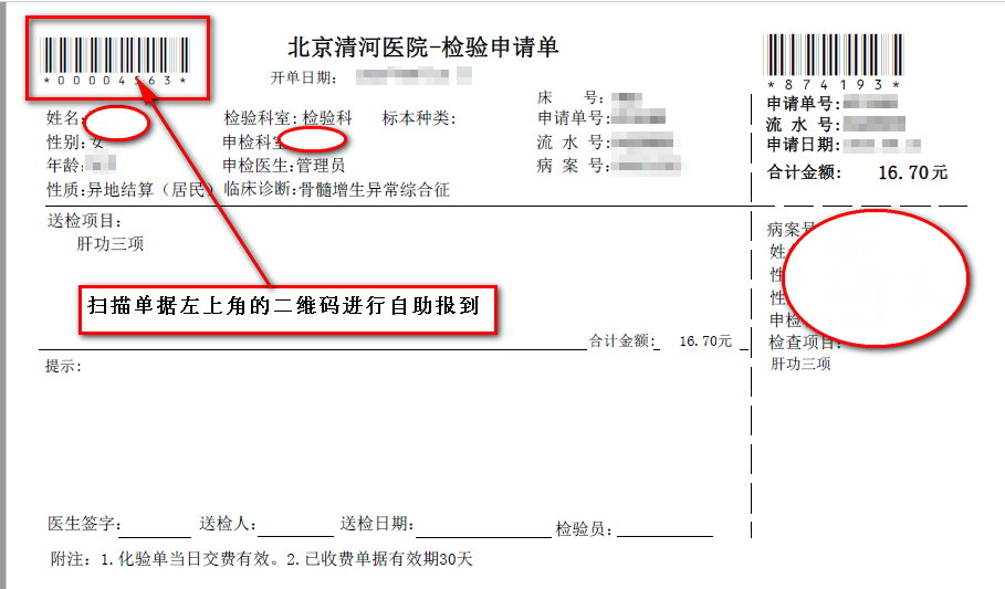 患者在采血前,只需前往医院设置的自助报到机处,通过两种便捷方式完成报到:一是扫描诊疗单据上的门诊号码,二是直接将身份证放置在指定区域。需要注意的是,诊疗单据自开具之日起30天内有效,若超出有效期则无法完成报到,建议患者在有效期内及时前往采血。