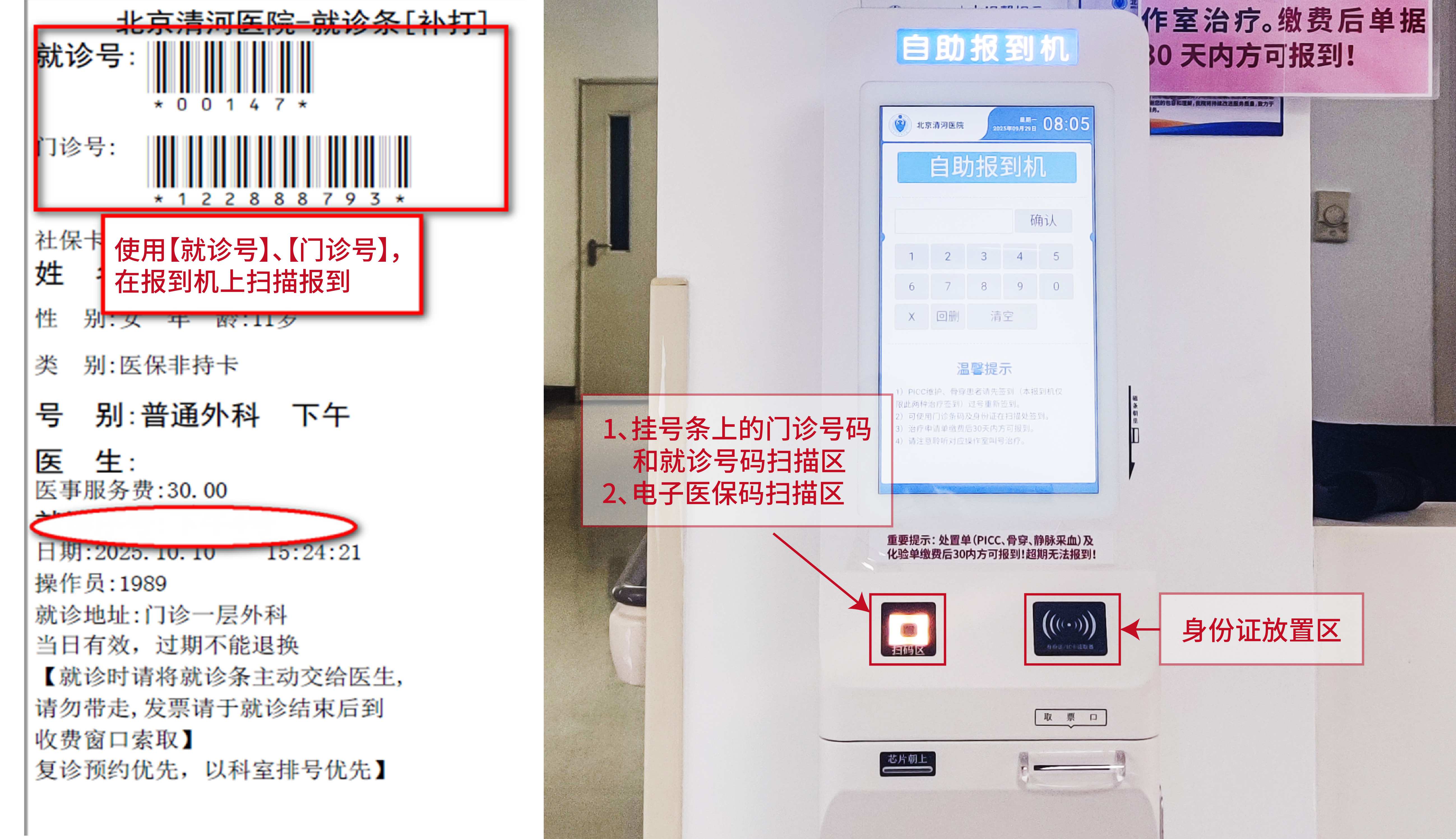1、完成报到:挂号成功到达对应诊区后,在自助报到机通过以下任一方式完成签到:扫描挂号条上的门诊号/就诊号、出示电子医保码、刷身份证。