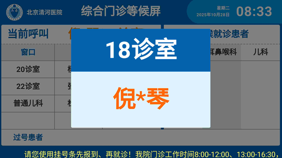 3、就诊提示:当听到“请XX到X诊室就诊”的语音播报时,即可前往指定诊室。同时,候诊大屏及诊室门口屏会同步显示您的姓名及就诊诊室信息,方便核对。