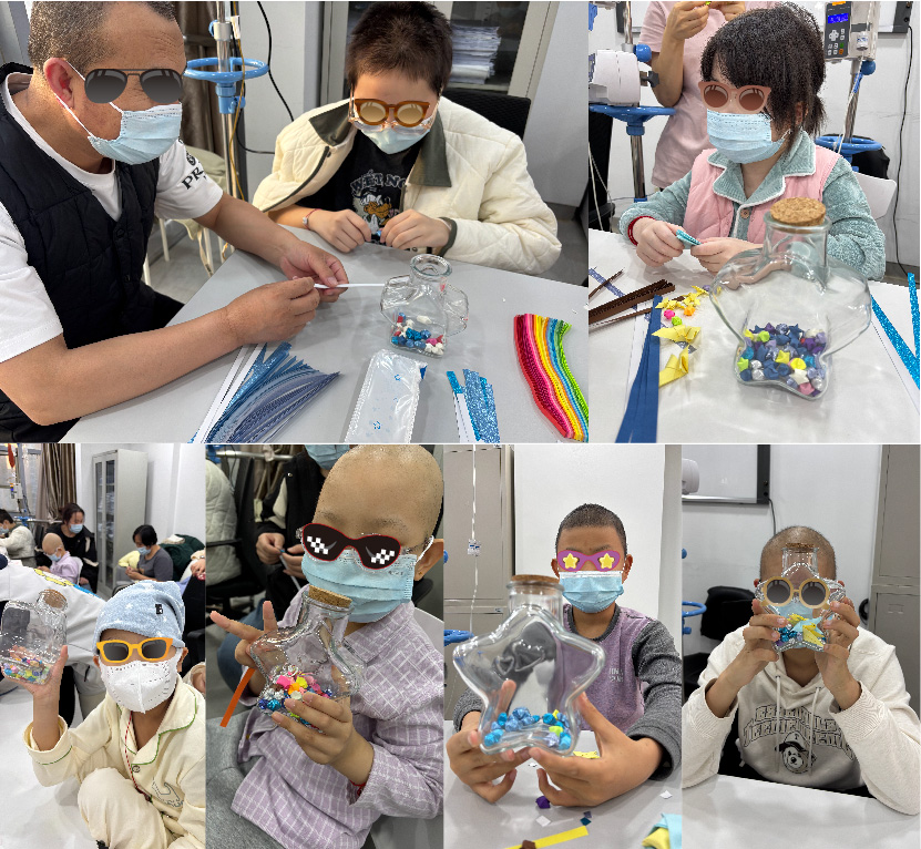 第三期主题为“英语折纸魔法课”病房课堂,吸引了11位孩子的热情参与,也让示教室格外热闹。志愿者带领孩子们学说“Great job!You did it!”的英文祝福语,手工环节大家折出承载愿望、希望的星星、千纸鹤等。爸爸妈妈们纷纷加入折纸比赛,大手小手共筑的愿望瓶,装满了色彩与希望。当孩子们紧紧抱着“愿望瓶”,我们读懂:最好的疗愈,是用心接住他们的光芒。