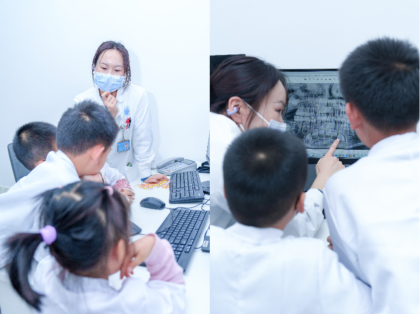 科普活动后,孩子们身着迷你白大褂,化身“小牙医”走进诊疗区。在医务人员指导下,他们通过看牙片,了解X光片如何“透视”牙齿健康。面对牙齿模型,孩子们现场演练“巴氏刷牙法”,确保每颗牙齿都清洁到位。